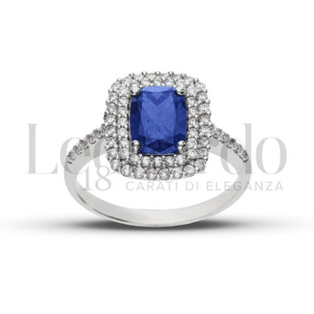 Anello da donna in oro bianco 18kt. grammi oro 4,50 . pietra blu centrale e contorno zirconi bianchi. misura 25Questo articolo verrà spedito con Scatola di lusso