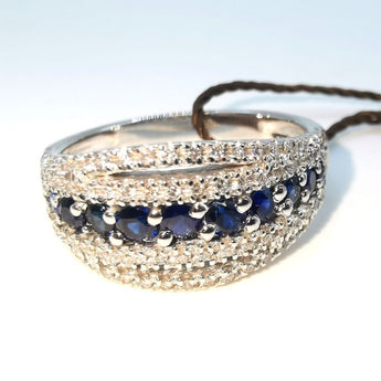 L'anello fascia in oro bianco è arricchito da diamanti e zaffiri, aggiungendo una lucentezza e un fascino senza pari. Perfetto per una donna elegante e sofisticata, unisce l'eternità dei diamanti alla magia dei zaffiri per un look unico e raffinato. Un must-have per ogni occasione.