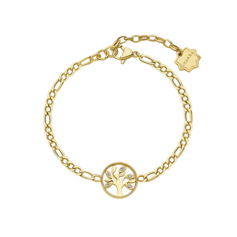 Bracciale da donna di Brosway della collezione Chakra. Gioiello in acciaio 316L con finitura in pvd oro e cristalli. Simboli: albero della vita. Misure: 18 cm e 3 g. La referenza è BHKB144
