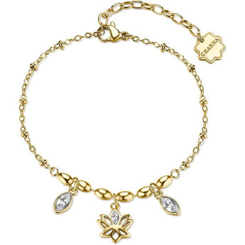 Bracciale da donna di Brosway della collezione di Chakra. Gioiello realizzato in acciaio 316L e pvd oro con pendente fiore di loto. Lunghezza: 19 cm regolabile