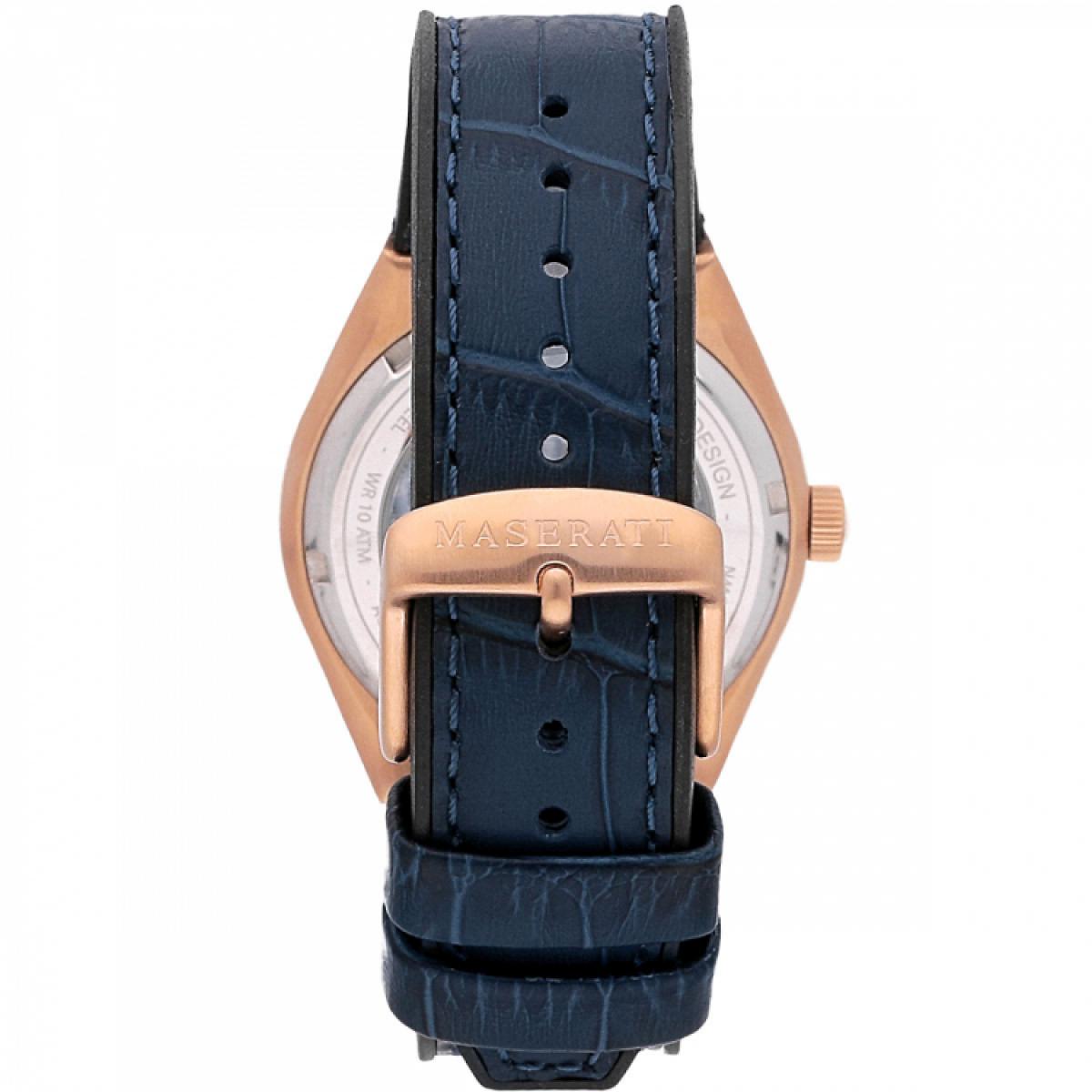 Orologio Solo Tempo Da Uomo Di maserati Della Collezione triconic. Modello Con Cassa In Acciaio Di Forma Rotonda, Diametro 40 Mm, E Indici Applicati. Questo Orologio Ha Bracciale In pelle blu. La Resistenza All'Acqua È Di 10 Atmosfere E Il Movimento È a carica automatica