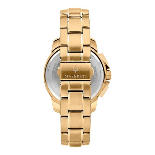 Orologio cronografo da uomo di maserati. Orologio con cassa tonda in acciaio con trattamento lucido e satinato del diametro di 44mm e bracciale in metallo di colore oro giallo. Modello con resistenza all'acqua di 5 atm. movimento a carica solare