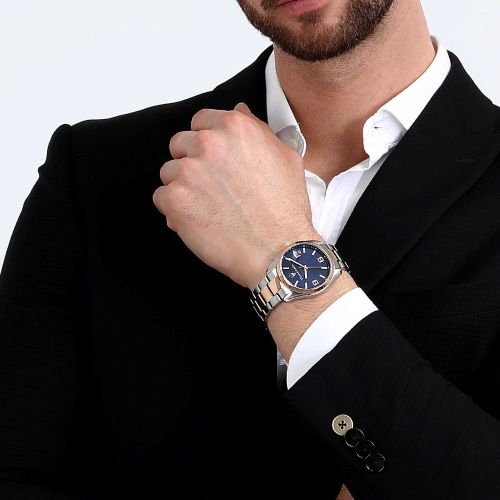 Orologio solo tempo e data da uomo di maserati della collezione attrazione. Orologio con quadrante blu e cassa di 43mm. Orologio realizzato in acciaio con vetro minerale. La resistenza all'acqua è di 5atm.
