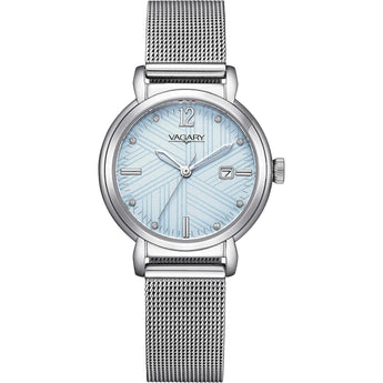 Orologio da donna di Vagary della collezione Flair. Orologio con cassa in acciaio dal diametro di 30 mm. Il quadrante è lavorato con motivi a righe azzurro con indici e cristalli. Il cinturino è in acciaio maglia milano con chiusura a gioielleria. Il movimento è al quarzo by Citizen. Le funzioni sono: solo tempo lady. Funziona datario: si. Il vetro è vetro minerale. La resistenza all'acqua è 5 ATM.