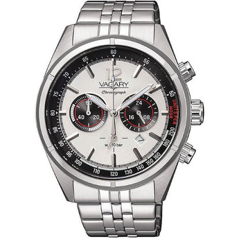 Orologio da uomo di Vagary della collezione Rockwell. Cronografo con movimento al quarzo citizen e resistenza all'acqua di 10 ATM. La cassa é in acciaio con lunetta fitta con diametro di 42 mm. Quadrante bianco con indici applicati. Bracciale in acciaio con chiusura a pulsante. Presenza di datario e vetro minerale. La referenza è: IV4-811-11.Questo cronografo verrà spedito con Scatola Originale Vagary By Citizen