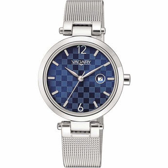 Orologio solo tempo da donna di Vagary by Citizen della collezione Flair. Il movimento è al quarzo. La cassa è realizzata in acciaio a maglia ed è di diametro 31 mm. Il bracciale è in acciaio a maglia. Il quadrante è di colore blu con indici e numeri applicati. La resistenza all'acqua è di 5 atm e il movimento è al quarzo. Il vetro è minerale. La referenza è IU2-910-71